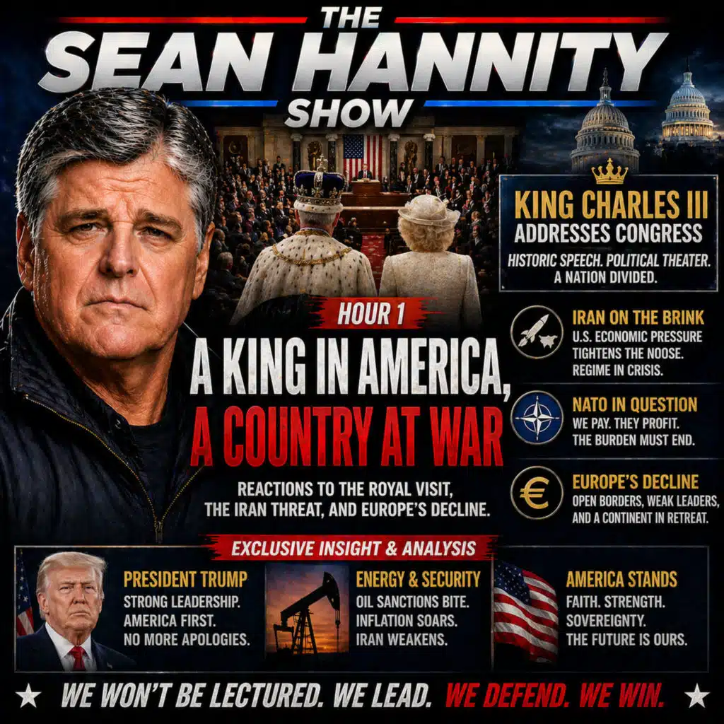 Sean Hannity opens the hour reacting to King Charles III addressing Congress, using the moment to launch a broader critique of Europe’s leadership, NATO burden-sharing, and what he sees as declining Western resolve. He pivots quickly to escalating tensions with Iran, explaining how U.S. economic pressure and a tightening blockade are pushing Tehran toward a breaking point. Hannity outlines the strategic implications of collapsing oil storage capacity, rising inflation inside Iran, and the potential for irreversible economic damage to the regime. This episode blends global politics, energy strategy, and cultural commentary into a fast-paced breakdown of where the West stands—and what comes next.