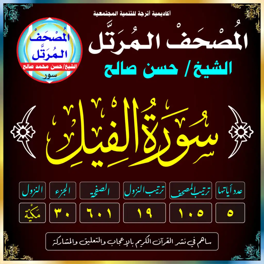 (سُورَةُ الفِيلِ /مَكيَّة /رَقَمُهَا 105 /عَدَدُ آيَاتِهَا 5 /تَرْتِيبُ النُّزُول 19 /رَقَمُ الصَّفْحَة 601)